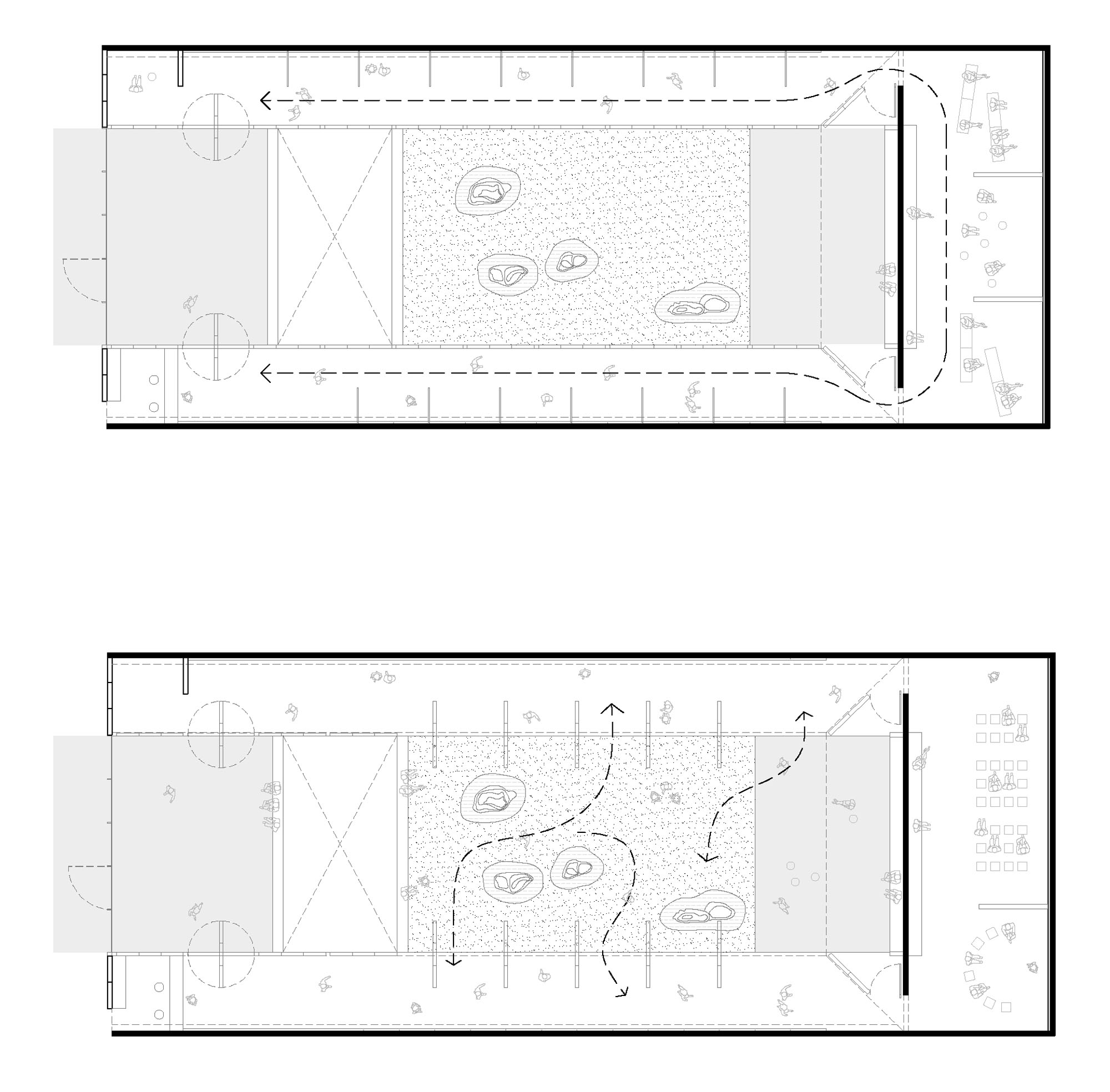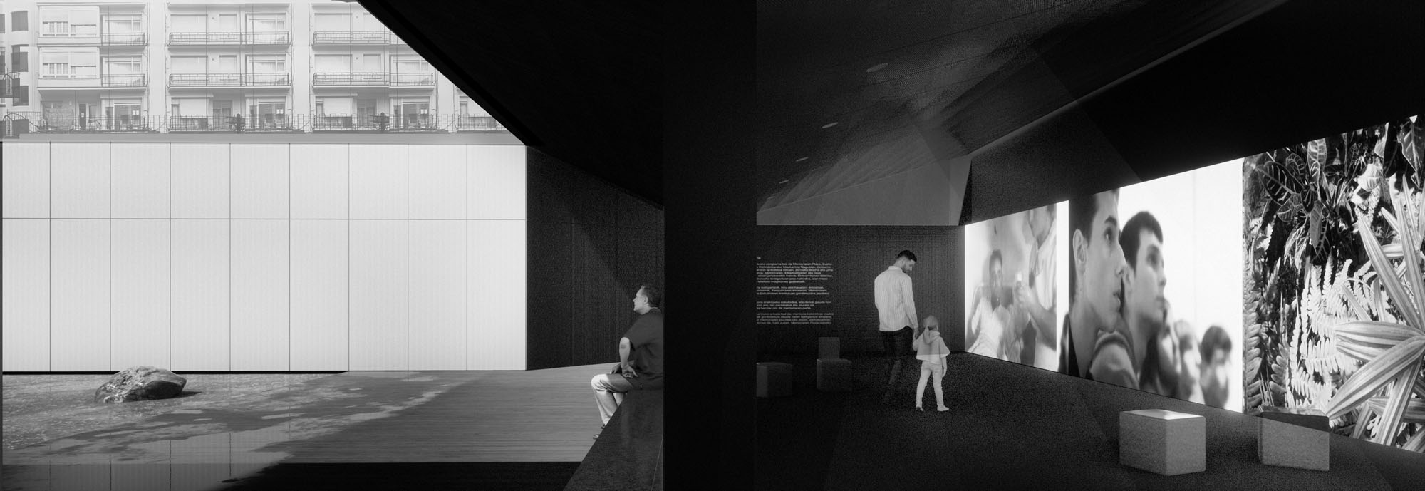 Mientras que el patio es luz, los pabellones son oscuridad. En estos se exhibirán cada pieza que construyó nuestra historia reciente, y de las que no debemos olvidarnos. Sin embargo, no se trata de establecer un orden o conducir al visitante a través de un recorrido. Para este proyecto no se considera al visitante como un mero espectador, sino que se lo considera como un ser activo. Al igual que la historia, una exposición no es un libro que debe ser leído en orden. Toda persona es parte de la historia y debe construir la suya propia. El objetivo es entonces, propiciar un espacio para que cada uno pueda construirla.